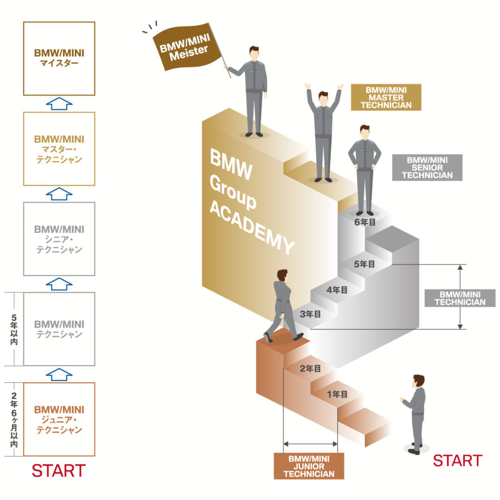 ジュニア・テクニシャン→テクニシャン→シニア・テクニシャン→マスター・テクニシャンの4段階を経てBMW/MINIマイスターの称号をもつ者は、全国テクニシャンの10.8%という狭き門となります。
