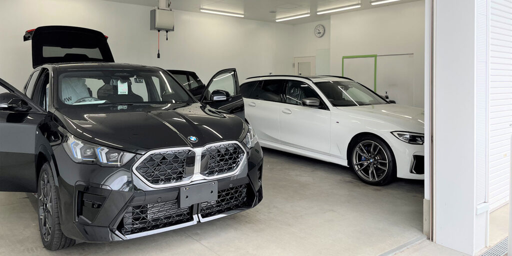 冷暖房完備の専用ルームでボディコーティング及びボディメンテナンス、納車前仕上げを実施。専門スタッフが作業を行う。